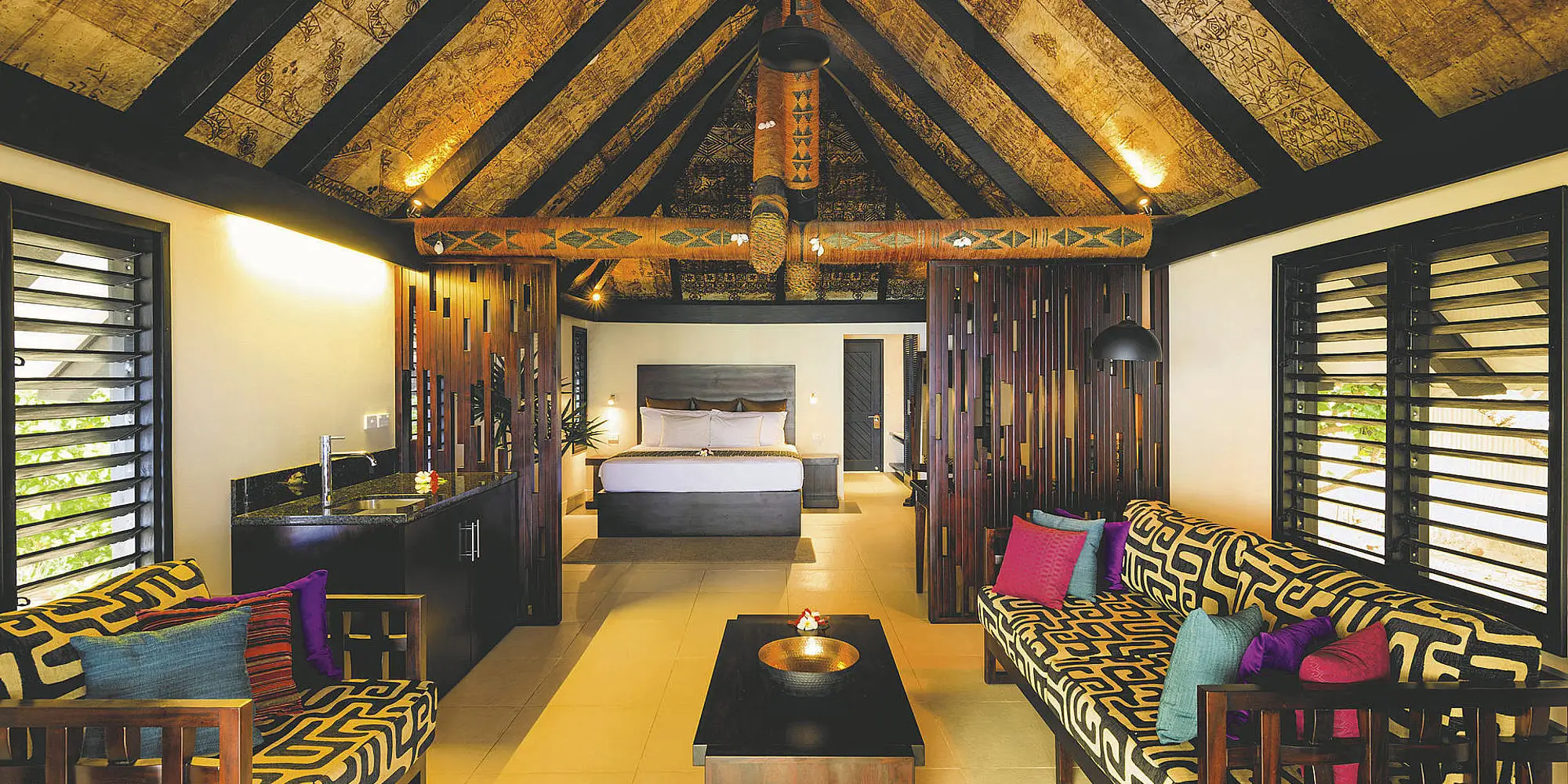 46 verblijven met airco en ventilator, koelkast, koffie-/theefaciliteiten, kluisje en terras. De zeer ruime beachfront bures met hoge, spits toelopende plafonds, versierd met Tapa en Magi Magi hebben tevens hangmatten en zwembad. De moderne beachfront villa’s hebben een aparte woon- en slaapkamer evenals terras met jacuzzi en ligstoelen, ook een buitendouche en mp3 docking station.