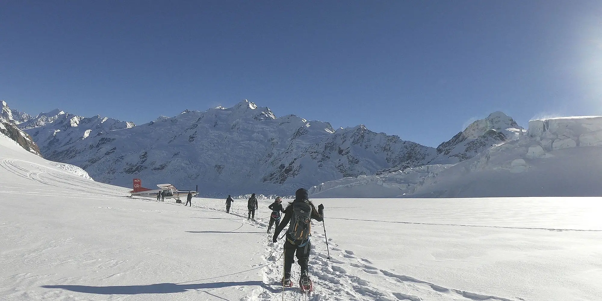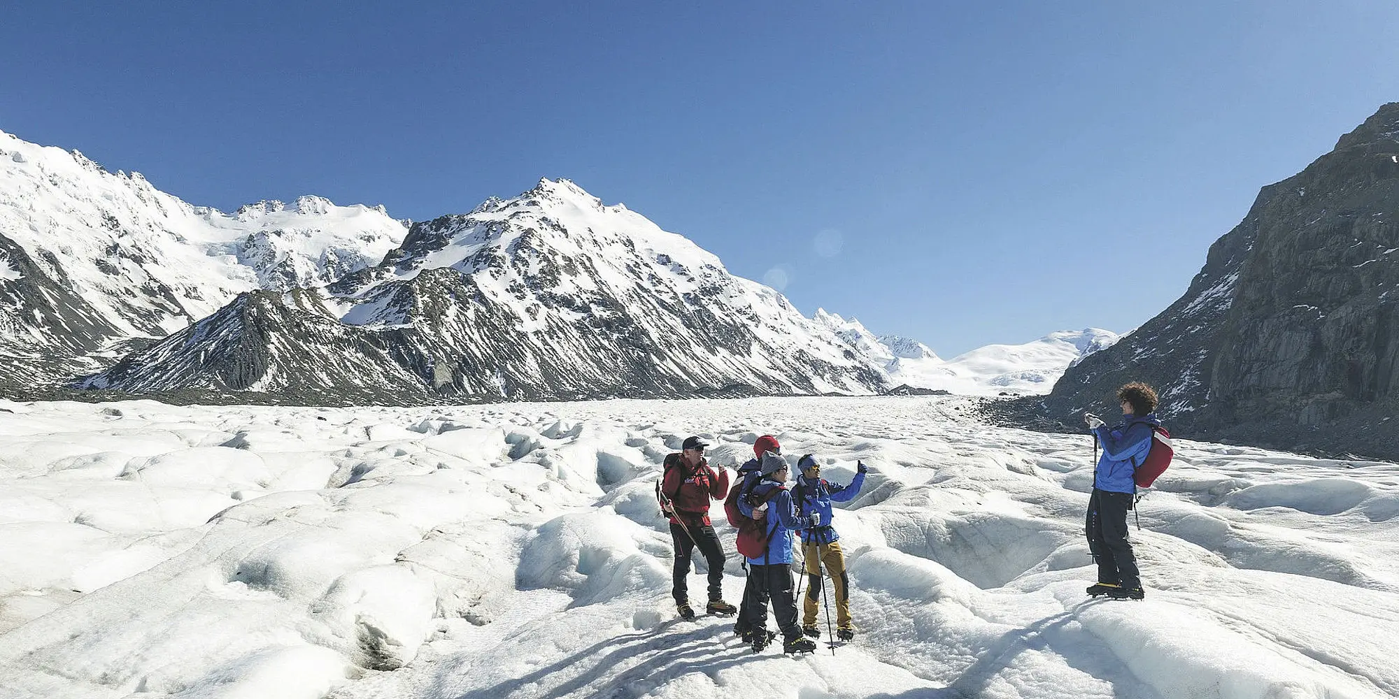 Terwijl u op 2.200 m hoogte vliegt, aanschouwt u hoe rotsen en sneeuw overgaan in glinsterend wit. In het gletsjermeer kunt u een ijsberg zien. Uitgerust met sneeuwschoenen, wandelstokken en andere benodigdheden verkent u de ijsformaties in deze omgeving die constant verandert. De terugvlucht brengt u aan de oostkant van de hoogste berg van Nieuw-Zeeland naar de Hochstetter Ice Fall.